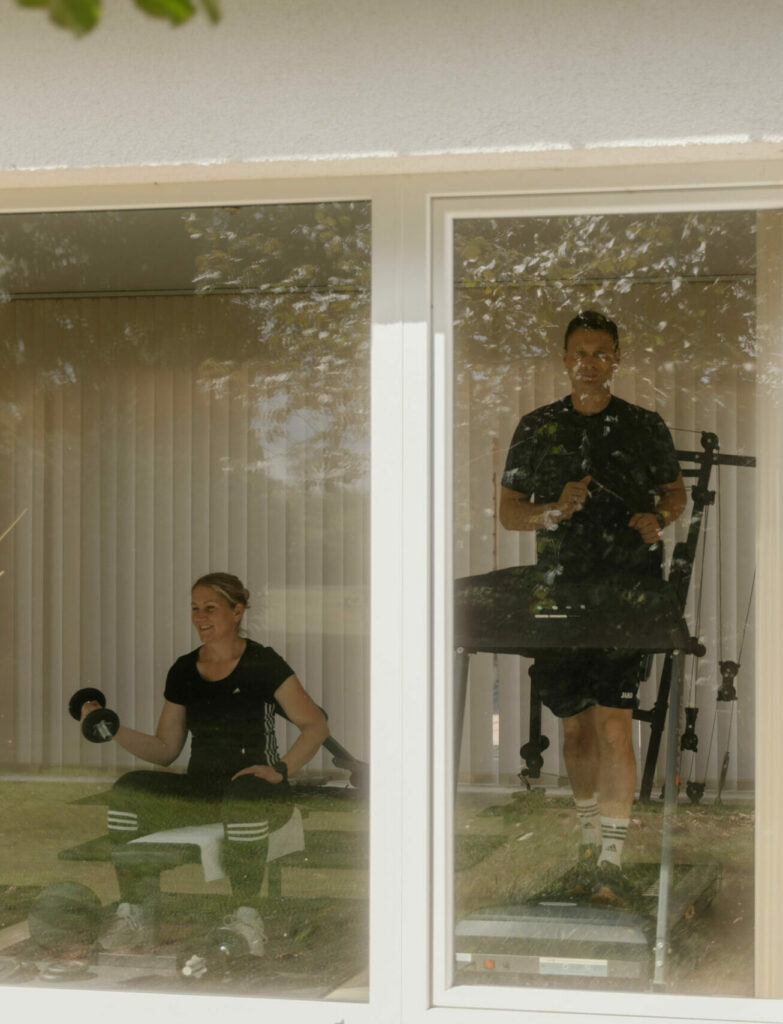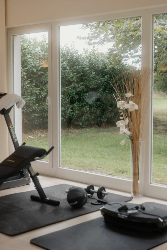 Für alle, die ihre Auszeit aktiv gestalten möchten, steht ein moderner Fitnessbereich mit ausgewählten Geräten und wunderschönem Blick ins Grüne bereit. Ideal, um in Bewegung zu bleiben – ob für das tägliche Training oder als Ausgleich zu entspannten Stunden im Wellnessbereich.